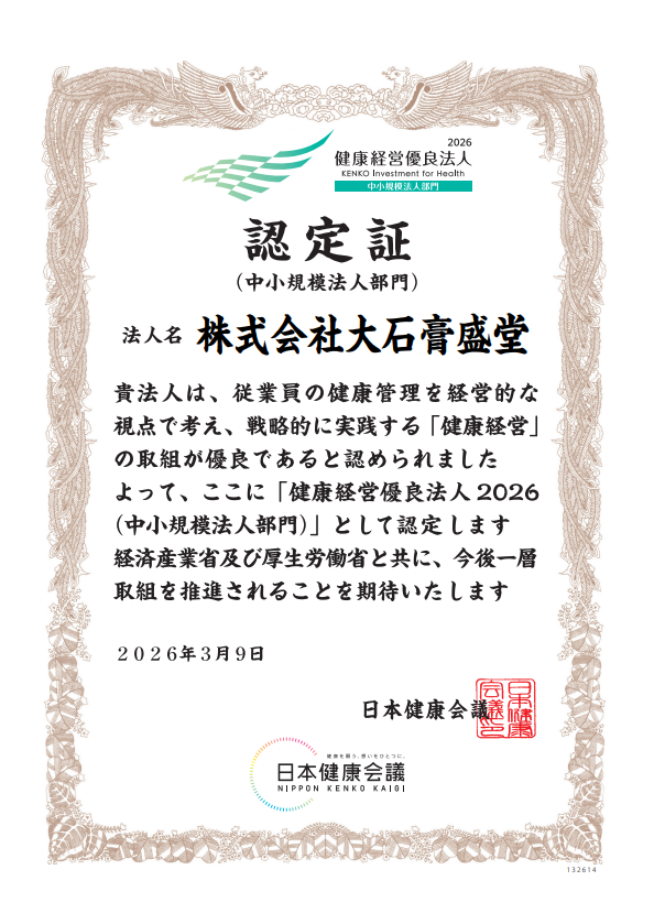 今年度も経済産業省創設の「健康経営優良法人認定制度」に基づき、 2026年3月9日㈪付で「健康経営優良法人2026(中小規模法人部門)」に認定されました。 今後とも従業員一人ひとりが個人として尊重され、安心して仕事ができる環境づくりに努めます。 ※健康経営優良法人認定制度とは 健康経営優良法人認定制度とは、 特に優良な健康経営を実践している大企業や中小企業等の法人を「見える化」することで、 従業員や求職者、関係企業や金融機関などから社会的な評価を受けることができる環境を整備することを目的に、 日本健康会議が認定する顕彰制度です。![]()